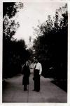 | Fotografía de María Luisa Salas y José Antonio de la O, ambos de pie en el corredor de una plaza, al fondo se observa un monumento. |