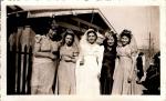 | Fotografía de Josefina de la O Salas el día de su boda acompañada por sus damas de honor Emma de la O Salas, Celia Téllez y Alicia Rojas. Al fondo se observa una mujer platicando con un niño recargado en un coche. |
