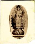 Fotografía ovalada, con un margen muy pronunciado. Es de alguna estatuilla de la Virgen en color sepia. Parece ser una fotografía de otra fotografía. |