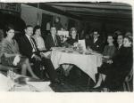 | Cena de celebración en la que participan parejas de invitados. Las personas en la fotografía se encuentran en torno a una mesa arreglada para una cena y con una vela encendida en el centro. Entre ellas se encuentran Antonio Castro Leal y María Elena Talamás. |