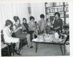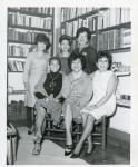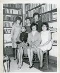 | Reunión de hombres y mujeres en la casa de la familia Castro Leal Talamás en la Ciudad de México. Según una nota, se trata de una reunión de compañeros de trabajo de Antonio Castro Leal. En las fotos aparecen mujeres sentadas, en torno de una mesa que tiene bebidas y botanas; todas llevan vestidos formales, medias y zapatos de tacón. Las fotos donde aparecen hombres, éstos visten traje oscuro y corbata, están de pie, al rededor del anfitrión, observando documentos de interés para todos. Se observan estantes que contienen libros de la biblioteca de Antonio Casto Leal Montaño. En todas las fotos aparecen los anfitriones, bien María Elena Talamás o Antonio Castro Leal. |