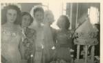 | La novia Bertha Elena Terrazas acompañada de su hermana Norma Terrazas y de dos de sus damas, Bertha Mayer y Leonor Vallina. En la foto se ve el pastel de novios, en la parte alta remata el pastel una muñeca vestida de novia. |