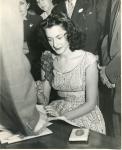 | Boda civil de Norma Terrazas. En el retrato se observa a la novia, con vestido de encaje y corsage. La observan firmar dos señoras. |
