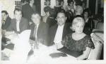 | Carlos Enríquez Barbier, segundo a la izquierda, sentado en una mesa junto a Luis Monroy y su esposa Gloria. Al fondo se observa un grupo de jóvenes. |