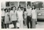 | Al frente los jóvenes Eduardo Enríquez y Rosario Uranga, a un lado la mamá del primero Bertha Elena Terrazas tomada del brazo de Gloria Uribe. Las mujeres visten pantalones. Al fondo se ve un camión de la línea Chihuahuense |