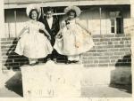 | Las niñas Norma y Ema en una fiesta. Al centro se ve un niño. Visten de largo y con sombrero. |