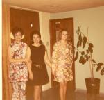 | Tres amigas en una casa junto a una maceta. La primera de izquierda a derecha, Bertha Elena Terrazas, viste pantalón y camisa, la de en medio Gloria Uribe, viste de negro y la de la derecha, Bertha Mayer, trae un vestido estampado. |