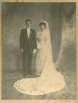 El novio con los guantes en una mano y ella con un rosario entre sus manos. Al reverso dedican la foto al señor D. Antonio Garcés y esposa como recuerdo de la amistad que los une. Fechada el 8 de noviembre de 1910. |