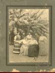 Grupo de siete mujeres, dos sentadas y cinco de pie, con vestido y peinado similar. |