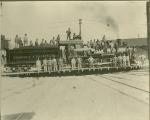 | Los trabajadores del Ferrocarril Coahuila y Zacatecas posan para la fotografía en grupo y sobre una máquina de ferrocarril. Felipe de Jesús Granada Valero de 18 años aparece arriba, sobre la cabina del conductor, primero de derecha a izquierda. |