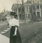 | Luz Ramos con vestido largo, en la calle frente a unas casas, en San Antonio Texas. |