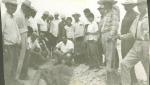 Grupo de hombres observando una zanja. Apenas se distingue a Ramón Rodríguez Narro en cuclillas, en el centro de la fotografía.