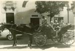 | Serie de dos fotografías de Emilio Arizpe y Concha Narro de Arizpe y de Ramón Rodríguez y María García de Rodríguez en Sevilla. En la primera se encuentran en una carreta tirada por un caballo en una calle de Sevilla y en la segunda frente a la Catedral de dicha ciudad. |
