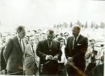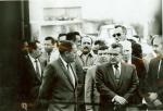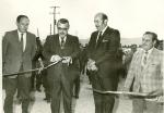 | Serie de dos fotografías de la inaugración del negocio de tubos de concreto de los hermanos Herminio y Ramón Rodríguez. En algunas aparece el entonces gobernador de Coahuila, Braulio Fernández Aguirre inaugurando el lugar, en otras los hermanos Rodríguez Narro y su contador Eleazar Galindo. También se aprecian las instalaciones y los tubos de concreto. |