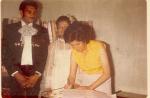 | María García firmando un libro de actas en la boda de Matilde Salinas y su novio. |