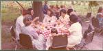 Grupo de personas sentados alrededor de una mesa, en una comida campestre. María García de Rodríguez con blusa amarilla.