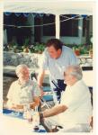 | Ramón Rodríguez y Luis García de Letona sentados a la mesa, de pie Javier García Villarreal. Se encuentran frente al comedor del hotel Rancho El Morillo. |