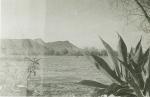 Vista de un paisaje semidesértico, del lado izquierdo se aprecia un maguey y al fondo unas montañas.