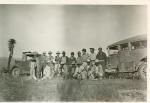 Apenas se distingue a un grupo de hombres en el campo. Atrás de ellos se aprecian dos automóviles.