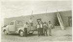 Grupo de niños y dos hombres frente a una casa en un pueblo. Del lado izquierdo se observa una camioneta.