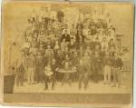 | Grupo de aproximadamente sesenta hombres y algunos niños. En primer plano, dos hombres sentados a los lados de una mesa con un reloj y varios libros. El hombre de la izquierda está cargando un bebé. Al fondo de la fotografía se aprecia un letrero "Tenería y Zapatería Dámaso Rodríguez". |