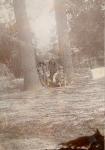 Grupo de niños sentados entre dos troncos de árbol. Apenas se distinguen Ramón Narro Gómez y los hermanos Suess. Al pie de la fotografía se lee "En San Lorenzo Ramón y los Suess".