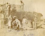 | Grupo de personas en el campo. Al fondo se observan hombres trabajando. Al frente se encuentran los niños Ramón y Sara Narro Gómez con un becerro. Al pie de la fotografía se lee "En el Pilar". |