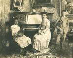 | Los hermanos Francisca, Ramón y Sara Narro Gómez en el interior de su casa. Las jóvenes se encuentran sentadas, Sara con una mandolina en las manos y Francisca frente al piano. Ramón se encuentra de pie con un violín bajo el brazo. Atrás se observan algunos cuadros. |