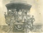 Grupo de personas a bordo de un vagón de ferrocarril. Entre ellas se encuentra Francisca Narro Gómez y abajo dos de los hermanos Rodríguez Fuentes. Al pie de la fotografía se lee "En el C y Pacífico, yendo para Patos".