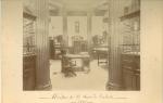 | Vista de las bóvedas del Banco de Coahuila en 1903. Se observa al fondo la puerta abierta de la bóveda y encima un reloj. A los lados dos armarios con papelería y al frente un escritorio y un cesto de basura. |