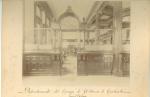 | Vista del departamento del consejo del Banco de Coahuila, en Saltillo. La entrada es un mueble de madera labrada y en la parte de arriba herrería. Al fondo se observa una mesa y una chimenea. |