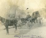 | Los hermanos Blas y Ramón Narro Gómez en una carreta tirada por un caballo, ambos con traje y sombrero. Se encuentran en el rancho San Nicolás, hoy rancho El Morillo, en Saltillo. |