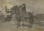Ramón Narro Gómez montado en una mula. Lleva sombrero. Al fondo se observa una carreta y hombres de campo. En la esquina derecha se lee "Ramón en San Fernando".
