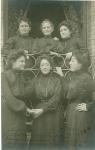 | Dolores Fuentes de Rodríguez al centro de la segunda fila, acompañada de sus hijas María de Jesús a la izquierda y Sofía a la derecha. En la primera fila su nuera Evangelina Gómez Portugal y sus hijas Dolores y Guadalupe Rodríguez Fuentes. Van vestidas de negro y están de pie en la ventana de una casa. |