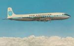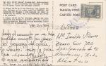 | Tarjeta postal de la aeronave Pan Am´s DC-7B que Orlando García envía a María Imelda Viesca García, el 20 de diciembre de 1959. Al reverso se lee: "Hasta el momento no se han podido cumplir tus deseos del trancazo del avión, ¡lo siento!" |